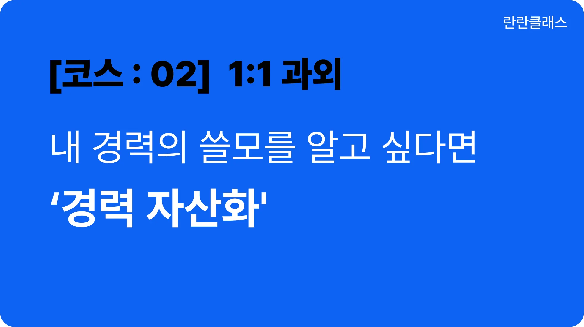 ‘경력자산화’ 1:1 클래스 25년 2월반 마감! 26년 3월반 모집중이에요. 1:1 과외라 나에게 최적화된 커리큘럼과 속도, 깊고 풍부한 배울거리, 당장 회사의 업무 고민 해결이 가능해요. 지금 바로 무료 상담을 받아보세요.