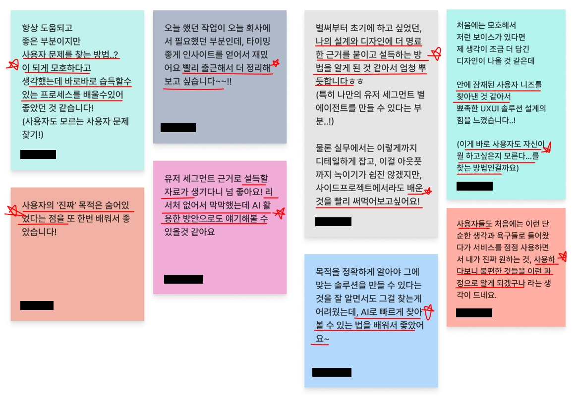 “사용자의 목적을 정확히 알아야 그에 맞는 솔루션을 만들 수 있다는 것을 잘 알면서도 그걸 찾는게 어려웠는데 AI로 빠르게 찾아볼 수 있는 법을 배워서 좋았어요~”